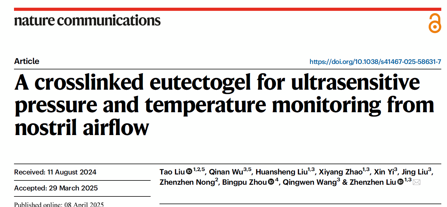 4月8日,beat365刘珍珍教授及合作者在Nature Communications上在线发表了可精确监测鼻息气流的多模态呼吸传感器的研究论文A crosslinked eutectogel for ultrasensitive pressure and temperature monitoring from nostril airflow。刘珍珍教授为论文唯一通讯作者,beat365在线唯一官网为第一署名单位。