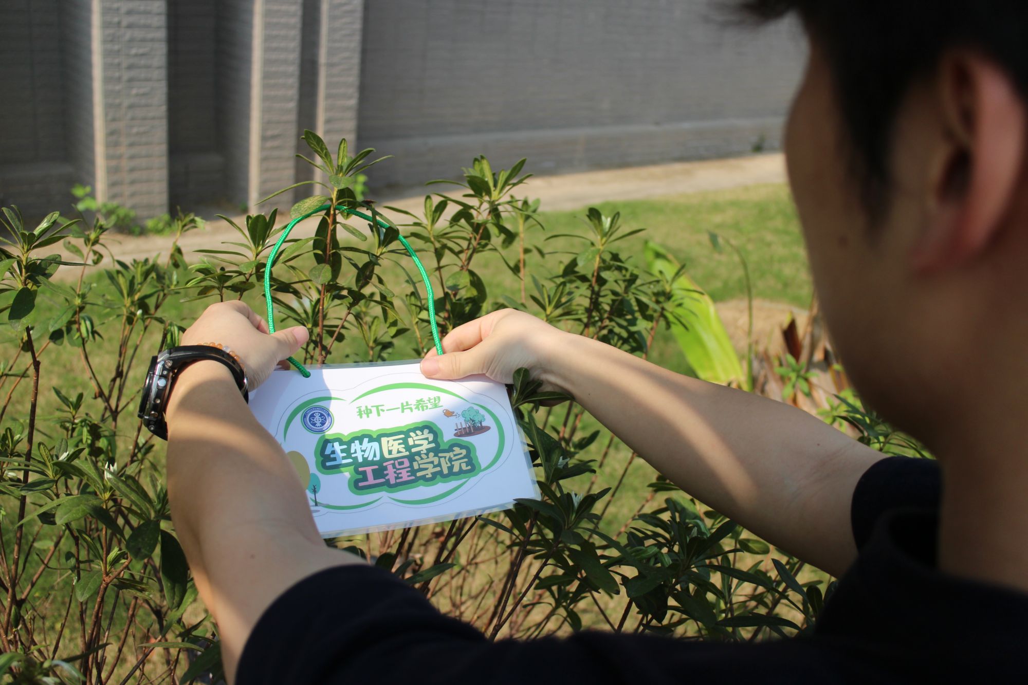 活动现场特别设置“绿色标语卡”悬挂环节,悬挂卡上有“种下一片希望”等标语,旨在在师生心中播撒了绿色发展的种子,号召更多师生积极行动起来,爱护绿化,共建绿色校园。