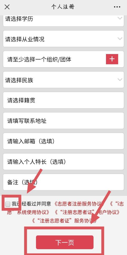第四步:选择组织团体“beat365在线唯一官网微阳志愿者服务队,勾选同意,点击“下一页”完成注册