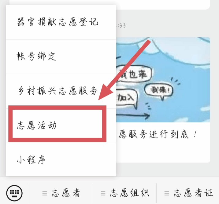 第二步:点击“志愿者”选择“志愿活动”