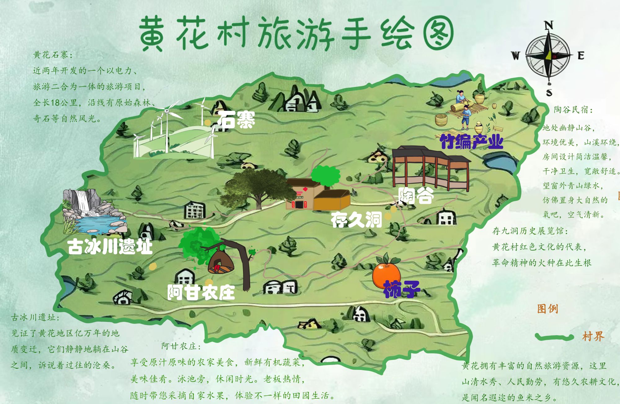 实践团实地调研当地的民宿环境和美食,结合黄花村的红色历史与自然景观,设计了一系列文创产品,提升黄花村的红色旅游形象。他们在存久洞革命历史展览馆设计了黄花村特色印章、风景明信片、教育卡牌游戏和纪念徽章等文创商品。这些产品设计简洁,富有纪念意义,并且得到了游客的认可。另外,考虑到黄花村缺乏路牌指引的问题,实践团根据黄花村的地形和行政区划,精心设计了立式路牌,为游客提供导航,进一步提升了黄花村的红色旅游形象。为了进一步提高黄花村的知名度,实践团利用现代营销手段,在抖音、小红书和哔哩哔哩等社交媒体平台上发布黄花村的民宿和美食照片,真实展现了黄花村的自然景观和红色文化,吸引了更多公众的关注。