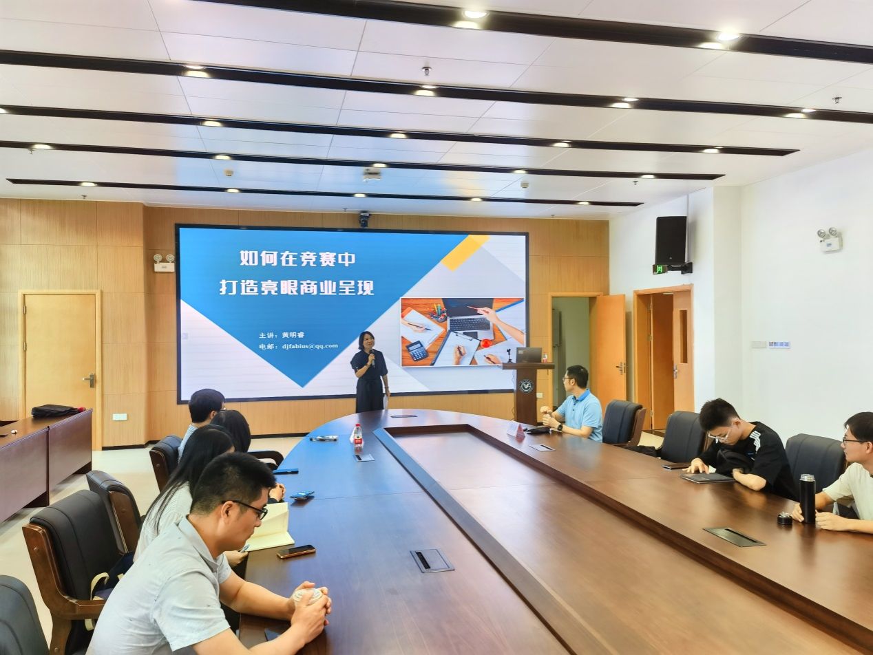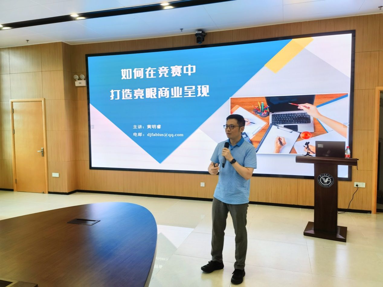 黄明睿首先从商业逻辑、项目名称、商业模式、呈现逻辑、控制技巧五个方面介绍了如何去打造和呈现令人眼前一亮的商业项目,他强调备赛一定要从大赛评委的角度出发,重点突出项目的特色和核心资源优势。随后他对往届创新大赛高层级项目做了细致介绍并展示了国赛金奖案例。最后他与师生们进行了问答交流,鼓励学生们积极备赛,争取在本届大赛上取得好成绩。