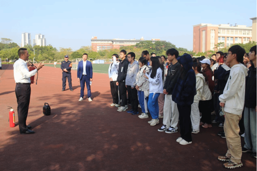 随后全体师生参加了消防器材实操演练。保卫处为大家现场演示了常用消防器材的使用方法,并进行了防烟面罩和灭火器的实操练习。在专业人员的示范下,大家掌握了“提、拔、瞄、压”四步操作法:提起灭火器,拔掉安全插销,瞄准火源根部,用力压下把手喷射干粉或泡沫。