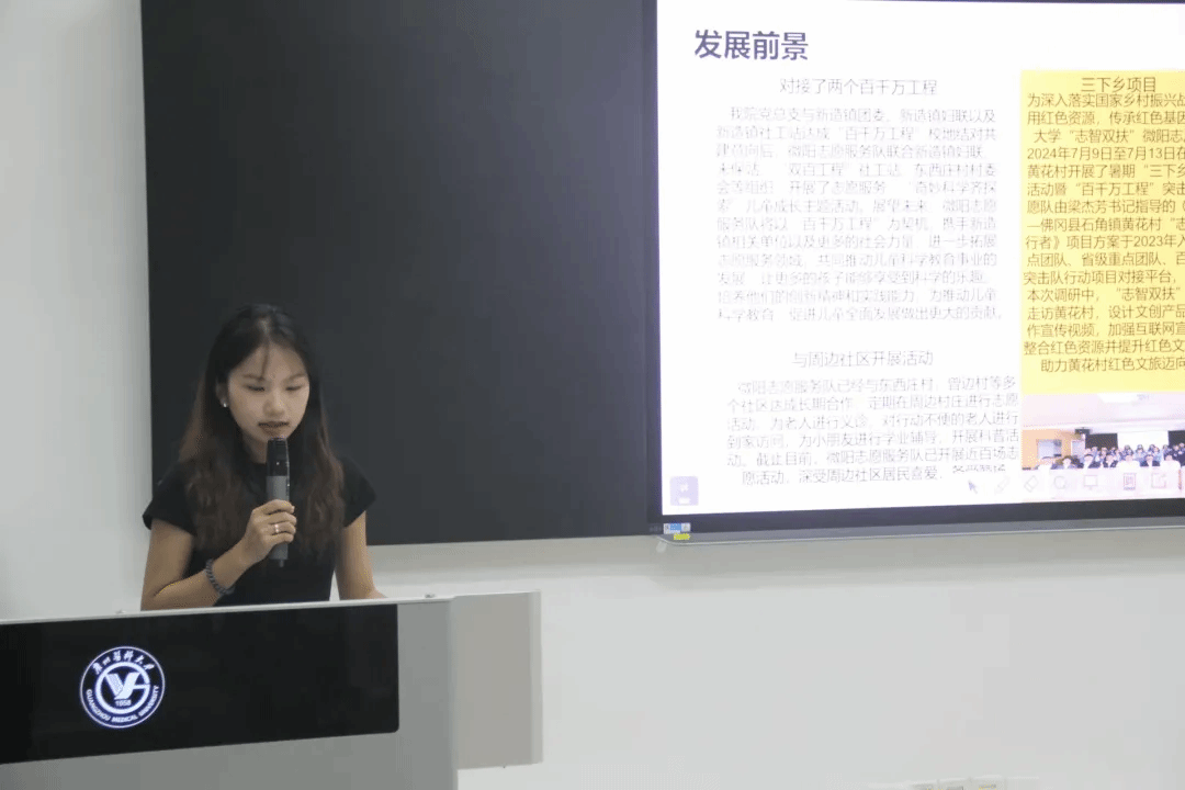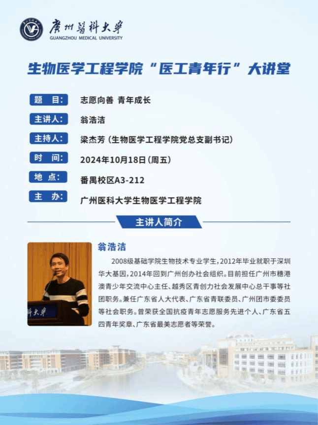 本次“医工青年行”大讲堂邀请了广州市穗港澳青少年交流中心主任翁浩洁校友,作“志愿向善 青年成长”的主题报告,分享志愿服务的经验。翁浩洁校友以个人志愿服务经历作为切入点,分享志愿服务理念和志愿服务技巧,并提出几点建议,一是找到志愿服务热情和初心;二是持续学习;三是学会表达沟通;四是学习志愿服务技巧和方法。在互动环节中,同学们积极提问,现场交流氛围热烈。翁浩洁校友的分享让服务队新成员对志愿服务有了进一步的认识和理解,激发了志愿服务热情。