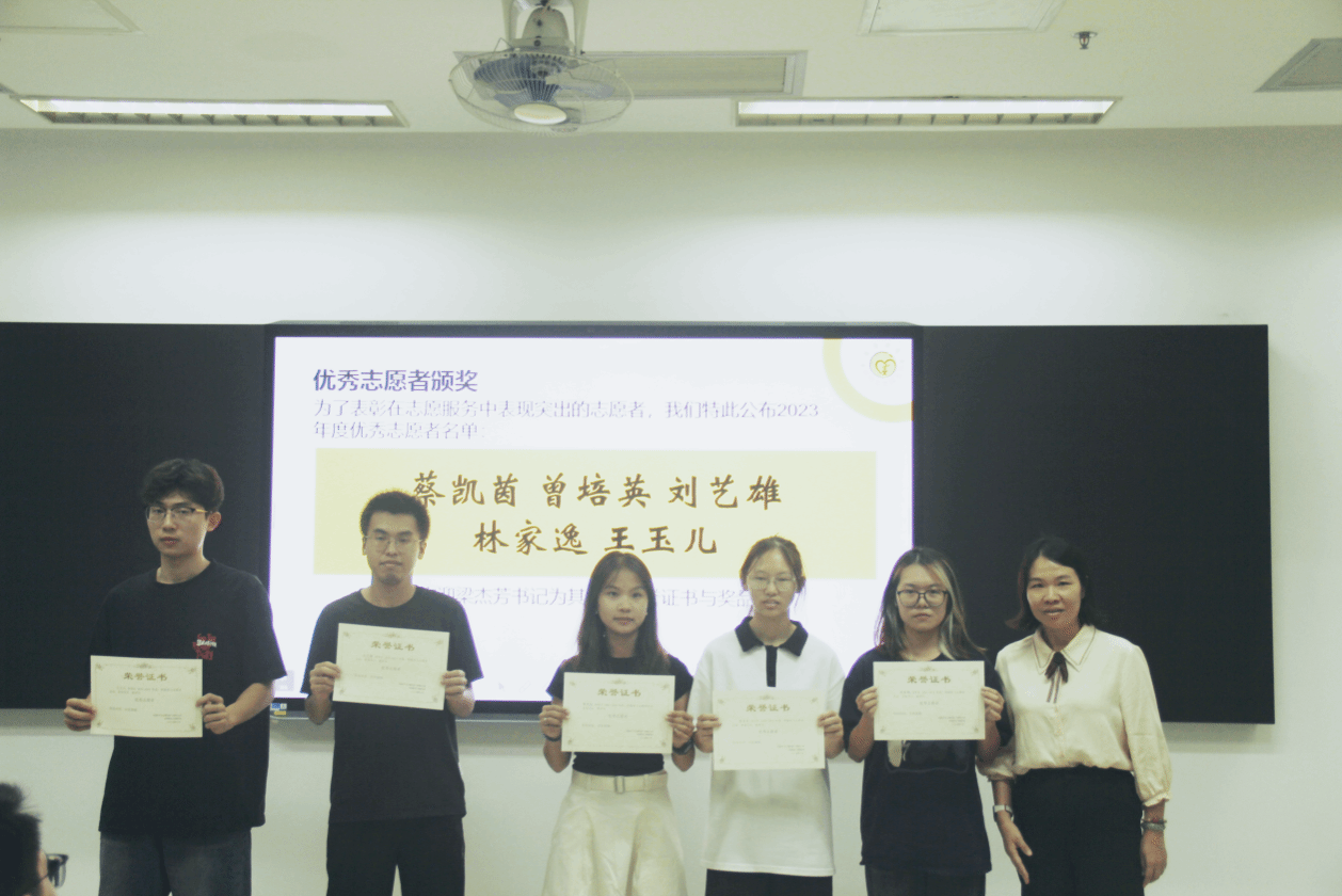 随后,微阳志愿队队长王玉儿宣读2024年优秀志愿者名单:蔡凯茵、曾培英、刘艺雄、林家逸、王玉儿,学院党总支梁杰芳副书记为获奖代表颁发优秀志愿者荣誉证书。同时,梁书记对服务队的发展提出了期望,强调了社会实践对个人成长的重要性,鼓励各位成员坚定理想信念,发挥自身优势,自觉增强社会责任感,脚踏实地,实实在在服务群众,发扬志愿者精神,为群众办实事。