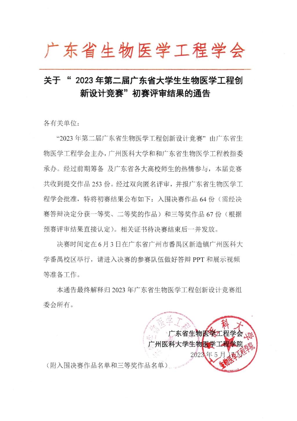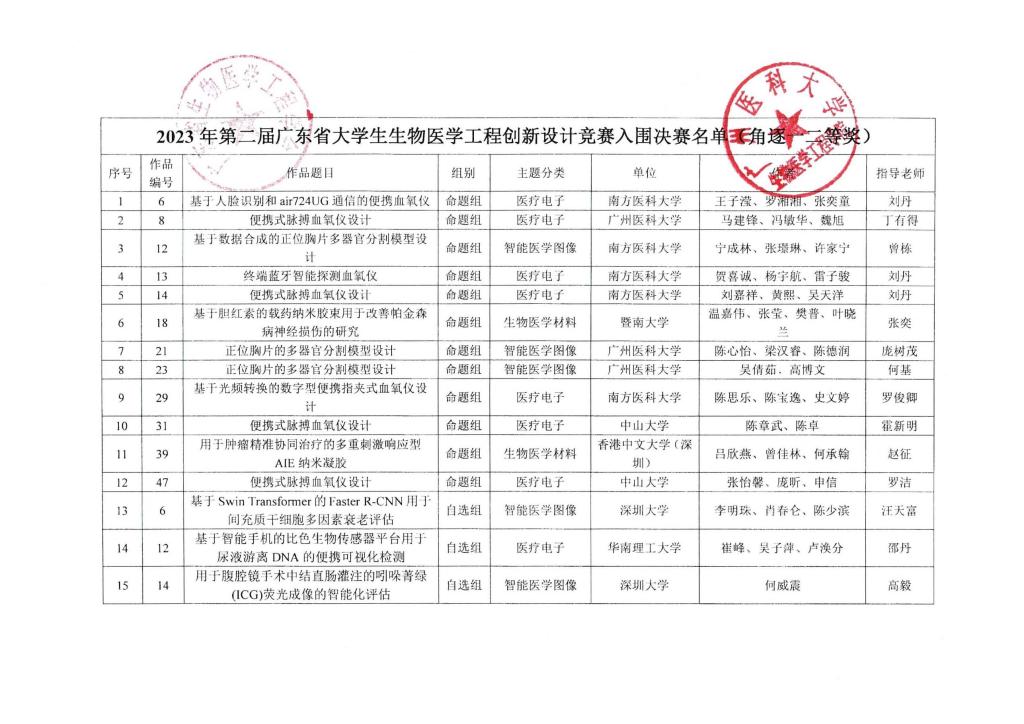 关于“2023年第二届广东省大学生生物医学工程创新设计竞赛”初赛评审结果的通告